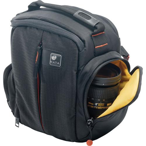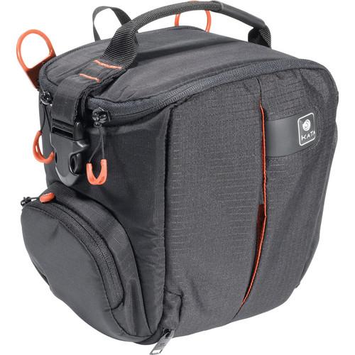 Te Kata Pro-Light Access-16 PL Holster (Black) designed to carry and protect a D-SLR camera body with up to a 16-350mm lens attached and accessories. The bag is made from light, durable ripstop nylon and polyester mesh with Aeriform foam padding and a specially formed foam encased spring steel Spine Guard that runs down the front of the bag for ultimate structural protection. The Holster provides rapid "pull to shoot" opening to the main compartment. When needed, the bag can be elongated by unzipping a bottom extension. There is a removable double-sided Elements Cover for protection in all weather and environment conditions against rain or sunshine. It is packed in its own mesh pouch. The holster has a large zippered side pocket and a small zippered side pocket for accessories. The bag is carried by a handle, a removable and adjustable GSS Gecko shoulder strap, or belt connection loops. Construction