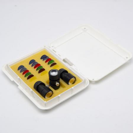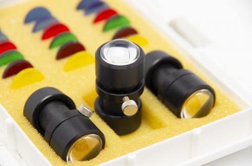 appears to be a set of focusing lenses for fibre optics with colour filters.