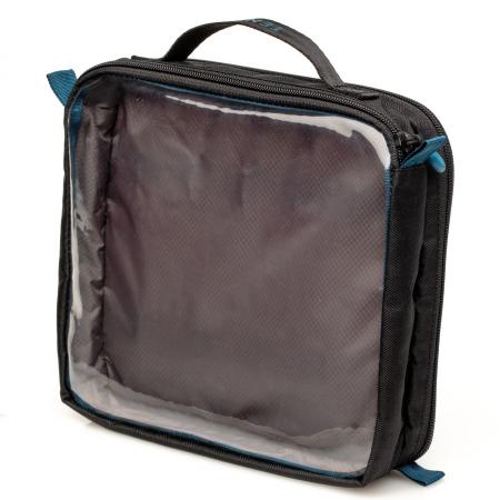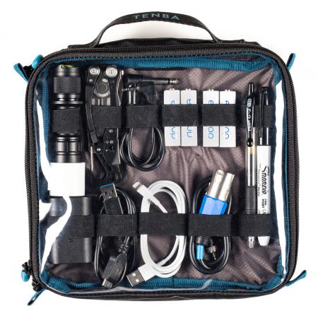 Tenba Tools Cable Duo 8 Pouch (Dual Sided)The Tenba Tools Cable Duo 8 Pouch now comes in the 300D herringbone fabric in black with dark grey interior. The PVC-free mesh-reinforced window fabric is now even more durable, with a slightly more translucent finish. The unique 2-side pouch remains deep enough on one side to fit chargers, lightmeters, radio triggers, microphones and other larger accessories, and the shallow side keeps cables neatly organised and wrapped with its built-in elastic loops. The 21cm length will fit most popular wireless lavalier microphones without needing to bend the antenna. The deep side of the case has a short top zip for quick access, and the cable side has a zip-around flap for easier organisation.
