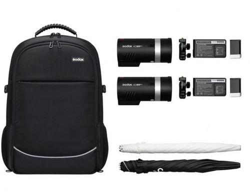 DescriptionGodox AD300Pro Dual Flash Backpack kit was put together to offer photographers a small, lightweight solution, meeting the needs for quick and basic lighting setups carrying your photo gear in one bag to make your outdoor photography journey easier. Beyond the two lights, the kit also includes a one silver umbrella, a translucent umbrella, and a durable backpack for easy storage and transport. The kit offers two Godox AD300Pro Flashes which are small, lightweight but powerful 300Ws strobes featuring precise power control in 1/10th step increments and a built-in bi-colour modelling light to aid your pre-visualization. Godox AD300Pro fully supports TTL and HSS, characterized by its short recycle time and stable colour temperature. CB20 Backpack Build to Withstand, Build with Thoughtful Details The backpack has a reflective strip for enhanced visibility when walking at night. The exterior of the backpack is made of lightweight and smooth nylon fabric, wear-resistance and waterproof. The inner layer adopts a firm polyester lining with a honeycomb texture. Full perimeter zippers give you access from all sides; With structure reinforced handle and strap to give you more comfort; Removable waist strap to stabilize your load and with a safety whistle for personal security. Front compartment for a max 15-inch laptop; With side pockets to carry a small light stand and small softbox; With 4 lid pockets and a bottom mesh pocket to add extra storage and organizational capability; Carry your photo gear in one bag. UBL-085S/T Umbrellas The 2 lights kit also comes with two versatile 85" diameter umbrellas, one with silver interior (UBL-085S) and the transparent one(UBL-085T), designed to fit in the Godox CB20 backpack. The transparent umbrella has a transparent design for shoot-through use, to provide a flattering soft look. The silver umbrella can soften, broaden, and diminish the light output of your strobes. Both umbrellas include a corresponding diffuser cover.