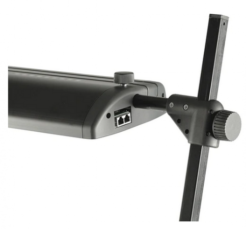 Lamp housings made of sturdy anodized aluminum section, can be swiveled, shifted and adjusted in height. Detachable soft screens. Vertical arms with height markings, tiltable with detents. Mounted with strong cast aluminum clamp bases, clamp width up to 48 mm (1.9 in.). Comes with mains adapter.