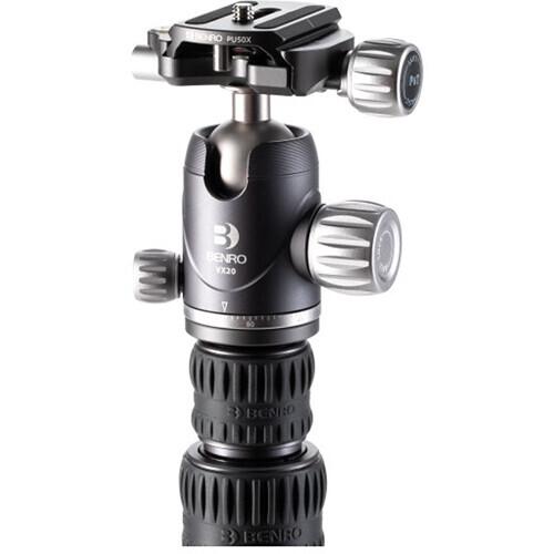 The Bat One Series Carbon Fiber Travel Tripod with VX20 Ball Head from Benro is a compact, lightweight tripod with a high load capacity and remarkable stability. The legs offer independent positioning with 5 available preset leg angles, allowing the legs to be placed in more positions that traditional tripods are capable of. The legs are also reversible for inverted shooting and compact storage and travel. The auto-hold leg position trigger makes adjusting the tripod leg angles quick and easy. The aluminum leg spider features three 1/4"-20 accessory mounts for attaching accessory extension arms, monitors, lights, and more. The rubber feet feature three distinct contact surface providing a grip whether the legs are vertical, on an angle, or nearly horizontal when positioned. VX20 Dual Panoramic Ball Head The VX20 ball head features dual panoramic mode, which allows panning head from its base and also from the quick release platform. The controls are simple with ball friction adjustment built into the main lock knob, plus an independent pan lock. It includes a PU50X quick release plate and features a quick release plate safety lock. Converts to Monopod The center column and one removable leg combine to form a full-featured 66.54" tall monopod. Auto-Hold Leg Trigger Change leg angles effortlessly with the push of a button, then press the pre-locking button when the desired angle is reached. Lightweight Aluminum Leg Spider Design The streamlined milled-aluminum leg spider allows the legs to be reversed for folding or inverted shooting. It includes three 1/4"-20 threaded accessory sockets, allowing lights, microphones, monitors, accessory arms, and more to be attached. Adjustable Center Column The two-section center column locks in place with an ergonomically enhanced twist lock collar and features a ballast hook. Ergonomic Twist-Locks Highly grippable twist lock collars make opening and closing legs fast and sure.