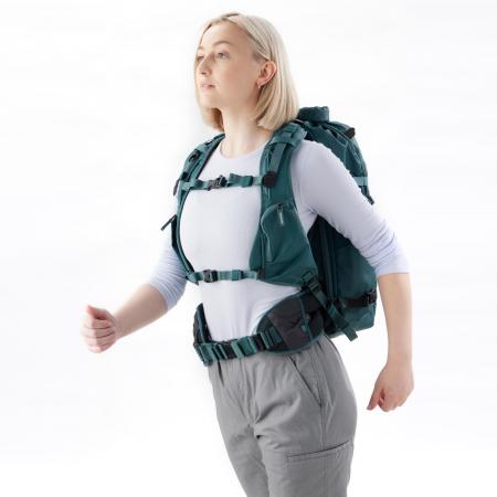 Shimoda Action X25 V2 Women's Starter Kit - TealThe Women's Action X25 is designed for female photographers looking for an agile, fast access and extra compact adventure camera bag. It's an efficient backcountry camera bag built for action in foul weather, ever-changing environments and challenging terrain. All Women's Series backpacks feature our Women's Tech Strap and Adjustable Women's Belt. The straps are designed to curve away from the chest area and are slightly smaller than our stock shoulder straps. The belt is also physically smaller and features 2.4 in (6cm) of adjustable waist diameter. This allows women with smaller hips to find a much better fit and take full advantage of transferring weight off their shoulders. The low-profile of the X25 will comfortably fit most non-gripped mirrorless and DSLR cameras (approximately 4.7 in or 13cm tall) via its included Small Mirrorless Core Unit. Its roll-top access allows users to expand or compress the volume to the demands of the day. It features multiple attachment straps, including TPU compression straps for greater durability when attaching skis, and its removable helmet holder (sold separately) lets users secure bike helmets to the outside of their pack. Action X's interchangeable and adjustable shoulder straps feature two zippered pockets to carry the latest pro phone sizes, a water bottle, or personal accessories. The Action X25, X30, X40 and X50 feature side camera access and two removable tripod or water bottle pouches that can be moved to the belt location for instant access to key accessories like snacks and lenses, or removed completely to save weight. Two padded sleeves protect laptops and tablets up to 14 inches. Finally, the removable belt, luggage-handle pass-through and hidden AirTag sleeve make the Action X25 a stealthy and stylish partner in urban and travel environments. If you're a female looking for a small and narrow camera bag that can handle action, adventure and cafes, the X25 is for you. *This Starter Kit includes an Women's Action X25 Backpack, Small Mirrorless Core Unit and Rain Cover.