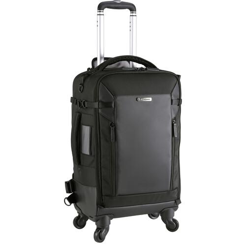 The black VEO Select 58T Camera Trolley Backpack from Vanguard is an incognito rolling backpack with ample interior space for your gear and an array of carrying and configuration options. The pack will hold three gripped DSLRs with attached lenses, four 400mm f/2.8 lenses, two flash units, plus accessories including cables and memory cards. Strategically placed interior and exterior pockets are useful for organizing your essentials. There are even protective sleeves for a laptop up to 16" and an 11" tablet . This rolling pack has a disguised look, so no one will guess you are carrying camera equipment. The interior is well padded and spacious with adjustable dividers for organizing and protecting your gear. Four spinning wheels and a double-bar handle make transporting the bag a breeze. The pack can be quickly transitioned from being wheeled along to being thrown over your shoulder. It has both a padded, nonslip shoulder strap and a reinforced sturdy grip handle for comfortable carrying. The pack is durable as well as water and scratch resistant to keep your items safe and dry. A total-coverage rain cover is included for protection when you run into wet weather.