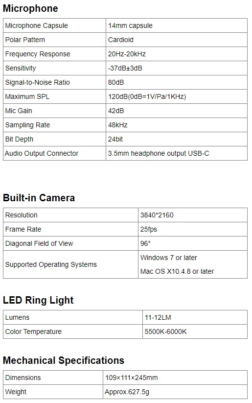 BOYA BY-CM6A USB MicrophoneThe BY-CM6A is a versatile desktop USB microphone with 1080P HD built-in camera, which works perfectly with Skype, Zoom, FaceTime, Hangouts, video conferencing, etc. Moreover, with a High-Def Built-in Camera, the BY-CM6A can easily help you gain a great quality of video at 1080P throughout your video calls, live-stream, blog, recording, as well as more occasions. Excellent Vocal Recording - With the integration of 20-20KHz frequency response as well as up to 24bit/48KHz resolution, the BY-CM6A captures crystal-clear voice while delivering lush detail for your vocal recording. Adjustable Ring Light - With a single touch, the ring light can be adjusted to easily suit your needs. Through providing enough light to pass through for clear pictures anytime, the BY-CM6A keeps you always looking perfect in the video. Perfectly Fit in Any Environment - The 90 degree wide-angle view design on BY-CM6A allows the screen to accommodate a multi-person team at the same time, Ideal for conferences, live streaming, presentations, etc. Ultra-low Latency Monitoring - The BY-CM6A is equipped with a 3.5mm headphone jack for monitoring your voice, ensuring perfect sound quality during recording. Onboard Controls - The BY-CM6A always makes your recording easier through quickly controlling headphone volume, mic mute, and gain knobs.