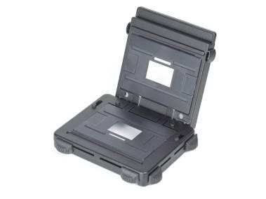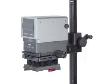 For sizes up to 24 x 36 mm (35 mm film) and lenses up to 50 mm focal length. Lamp head with 75 W opal lamp, lamp adjustable. Removable compound negative carrier with negative masks for size 24 x 36 mm and slide sizes 5 x 5 cm (2 x 2 in.). Optically ground single condenser. Lens stage with spirit level and red filter. Quick change attachment for lens. Can accomodate filter drawer. Height adjustment by hand crank-operated friction dirve on plastiv bearings. Column with cm and inch scales. Floor projection possible.