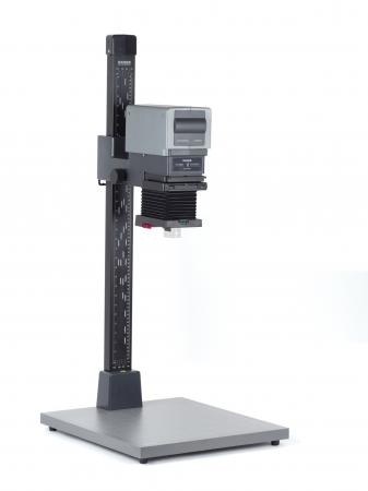 Wide, vibration-resistant column of embossed aluminium tubing, with dull black anodized surface, cm and inch scales and markings for enlarging scales. Matt-gray laminated baseboard with individually height-adjustable feet. Spirit level on column base.