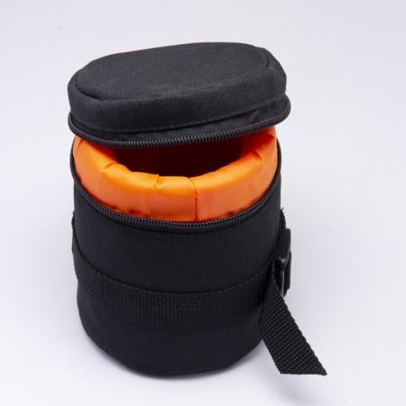 Lens pouch unbranded 12 cm diameter and with 20cm height. Black with orange interior. Used for hire lenses. Excellent condition