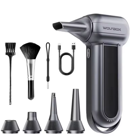 - Versatile Cleaning Tool: Featuring 5 nozzles and 2 brushes, the WOLFBOX electric air duster is perfect for cleaning electronics like PCs and keyboards, as well as for home, car, and outdoor use. It’s also great for inflating gear or managing campfires, making it a must-have for multiple scenarios.