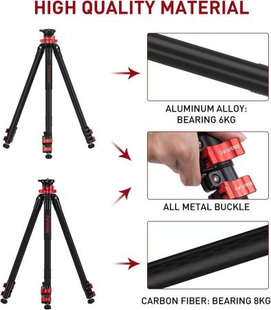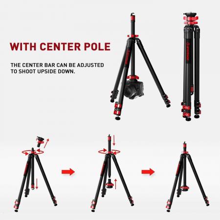 Additional Gazelle TA6S features include ergonomic leg locks that allow for single-handed use, spiked feet with retractable rubber pads, a 3/8"-16 accessory mount, a weight hook, and a 3/8"-16 camera screw. Remove the center column to lower the tripod to 19.6 cm or extend both stages to rise to 165 cm. The included Allen wrench can be used to adjust the leg locks and snap onto a leg for storage. Features