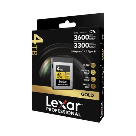 Built to Withstand Harsh Environments. The Lexar® Professional GOLD CFexpress™ 4.0 Type B Card features a rugged design that is temperature-proof, vibration-resistant, 12,000x wear-out resistant, dust-resistant (IP5X), 5m drop-proof, shock-resistant, bend-resistant, and 7x more compression-resistant than SD cards.