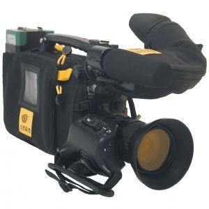 he Kata CG-4 Camera Glove is custom fitted to camcorders such as; JVC GY-DV5000, Panasonic AG-DVC200 or Sony DSR-570 & similar size camcorders. The glove holds the camera with lens, recorder, battery and viewfinder. The glove protects the camera from dust, extreme elements, dirt bumps and scratches. The Yellow Pull to open System allows quick access and one hand operation. The soft fabric of the glove can be cut for a custom fit to your camcorder. The fabric has 3 layers. An external layer of soft nylon elastic knit, which enables ventilation and is not abrasive to your skin. A middle layer of shock resistant advanced closed cell neoprene perforated foam prevents overheating of your camera. An internal knit layer protects the camera body. This non-fray lamination enables you to cut open additional slots to fit your exact working configuration. Self cut overlap flaps close to protect the camcorder controls from dust and scratches. Flexible viewfinder sleeves for perfect fit in any position. Rain Hood comes in a pouch which can be placed on the glove's side, rear or removed completely.